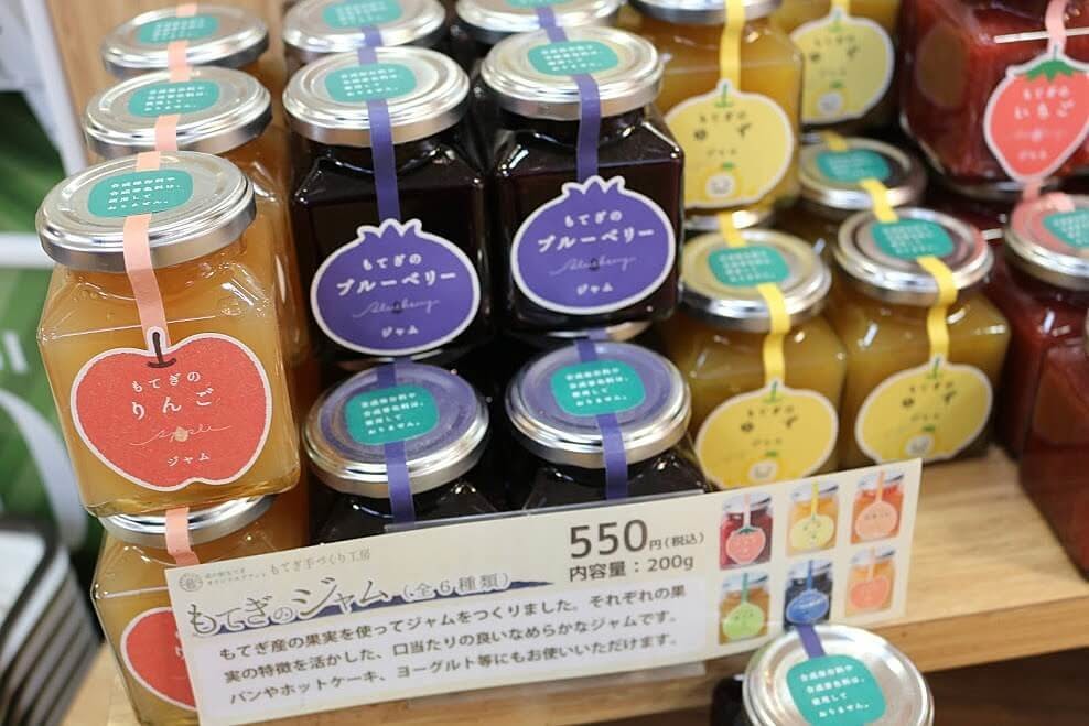 地元産の柚子、かぼちゃ、ゴマ(えごま)、さつまいもなどの、周辺農家で採れた新鮮な材料を使ったお土産品もたくさん。フルーツごろごろのジャムも、もてぎ産の果実で作られています。