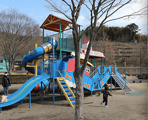 十石河川公園には、SLをイメージした遊具があり、子どもたちに大人気!