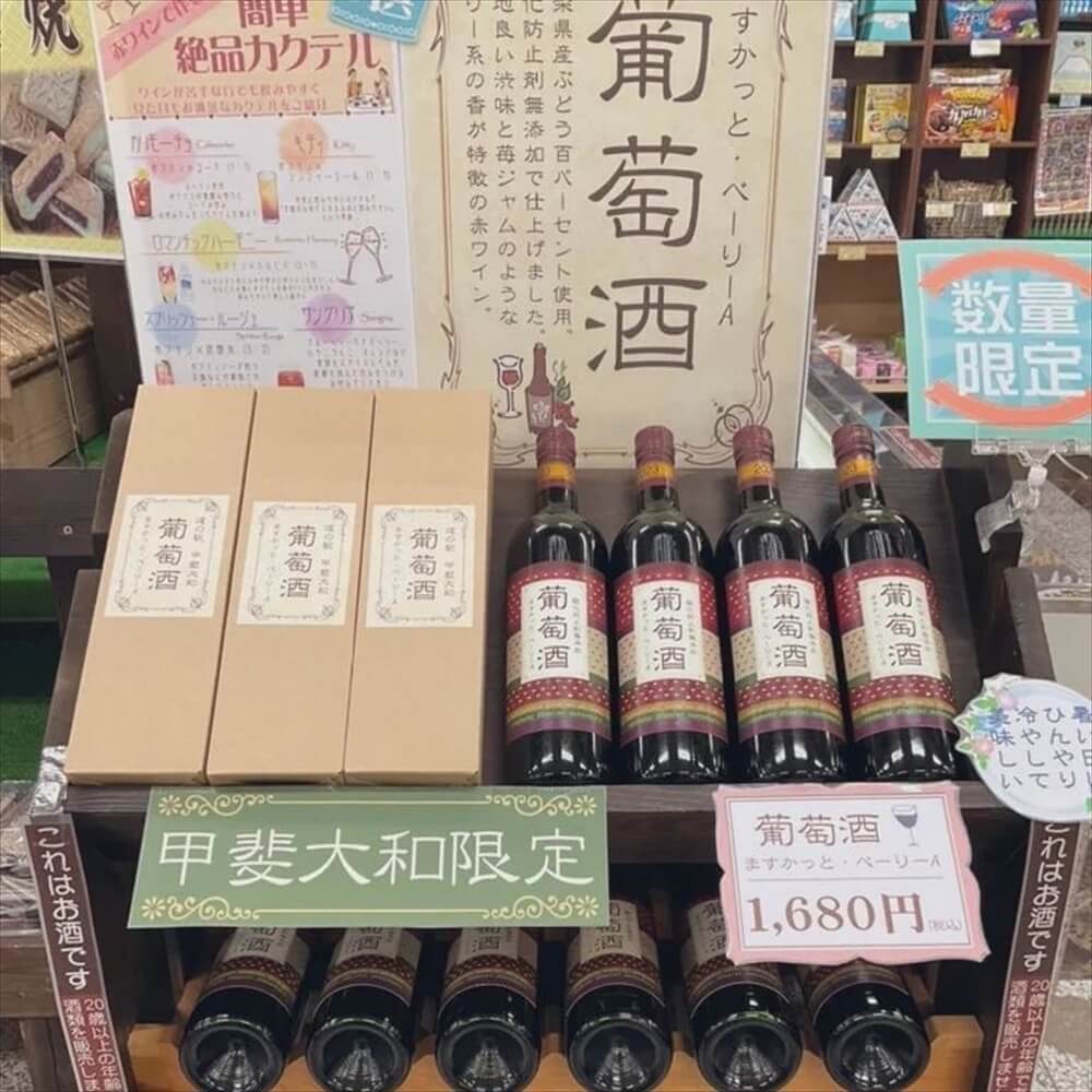 日本有数のワイン産地・甲州市ならではのワインが売店に並びます。甲州ぶどうを使った白ワインをはじめ、県内ワイナリーの銘柄がそろい、旅の思い出やお土産にもぴったり。
