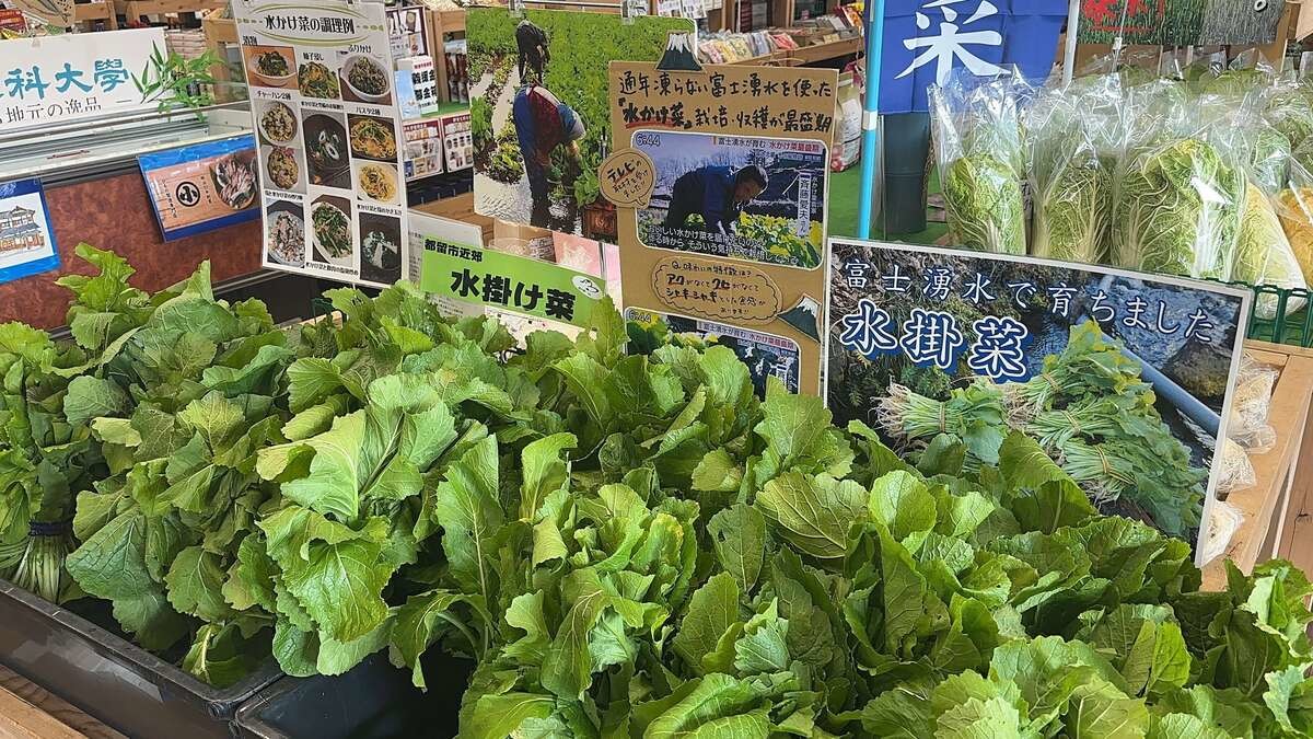 都留市近郊で採れた新鮮な野菜の中でも注目は、富士山の湧水で育つ希少な青菜「水掛け菜」。冬の時期だけ味わえる山梨の風物詩として、地元でも親しまれている特産品です。