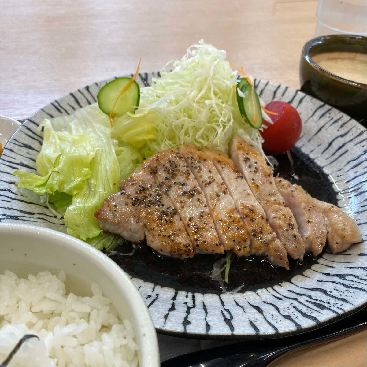 「富士湧水ポーク」を使ったワインビネガーソテー定食。やわらかく甘みのある豚肉に、ほどよい酸味が加わり、さっぱりとしながらコクのある味わいが楽しめます。