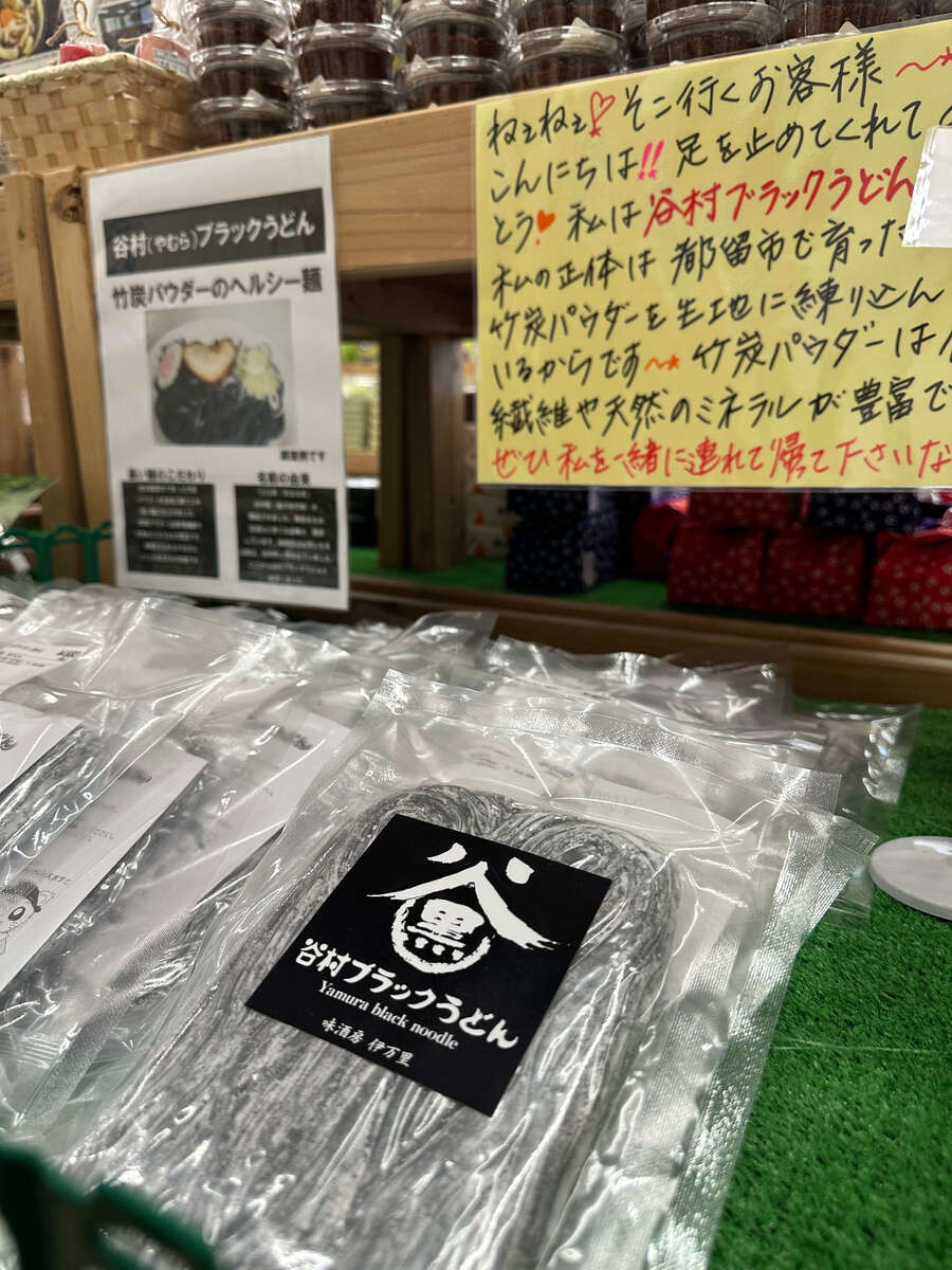 直売所では都留名物の 「谷村ブラックうどん」 が購入できます。木炭パウダーを練り込んだ真っ黒な麺は食卓でも話題になりそう。