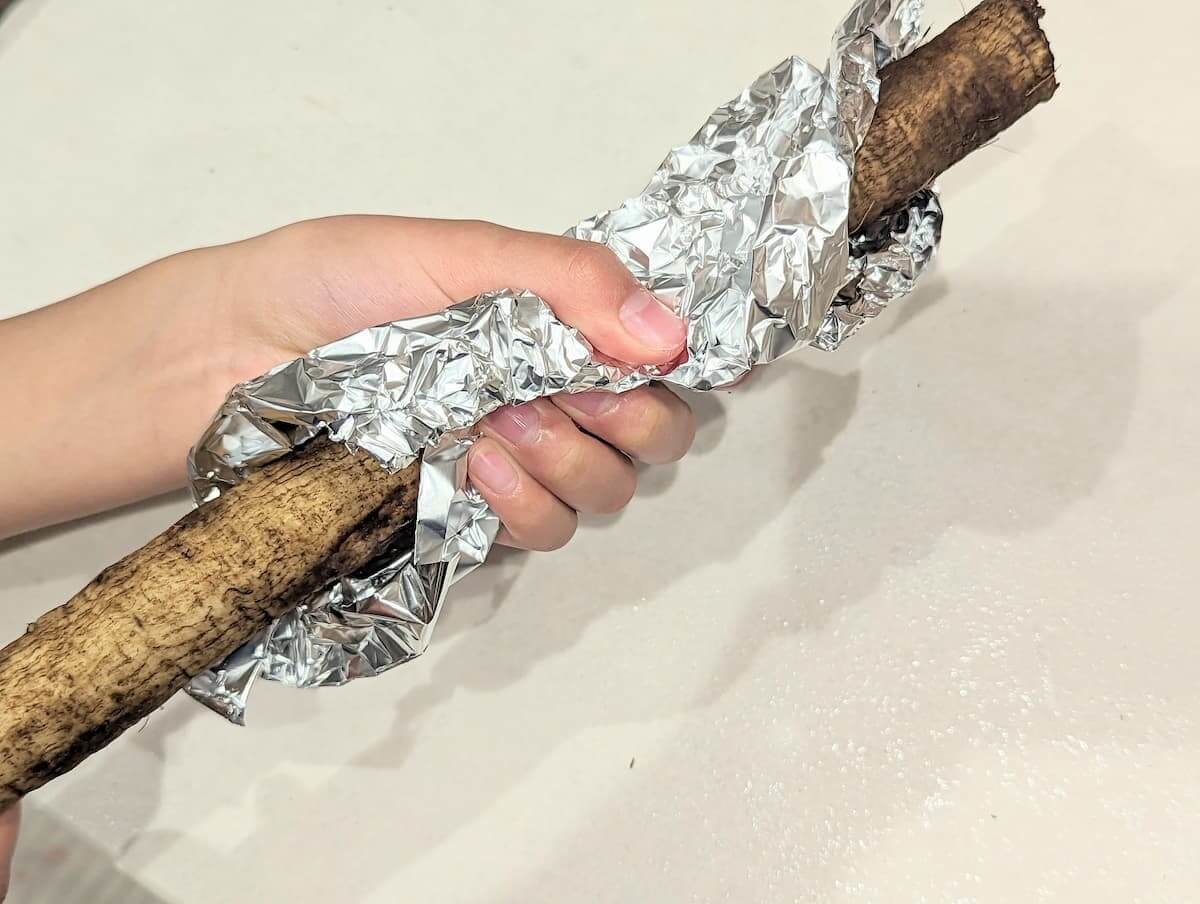 アルミホイルの表面がザラザラしているので、それを利用してごぼうを優しくこすりましょう。