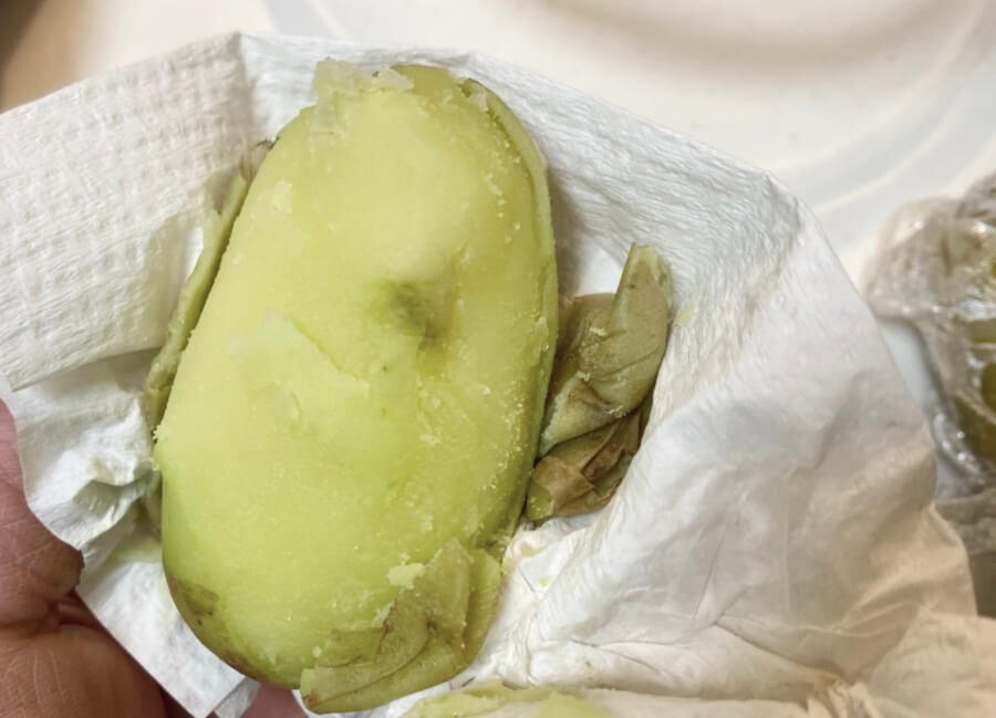 写真のようにキッチンペーパーでじゃがいもを包んで、ペロッと皮をむいてくださいね。