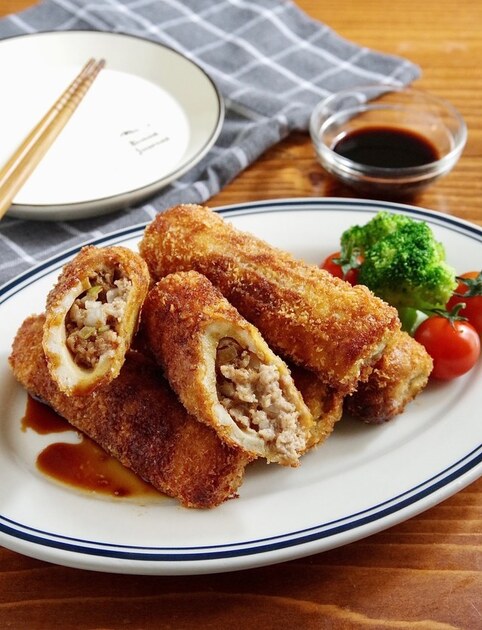 いつものメンチカツにちくわをプラス。お肉の量を減らしてもボリュームと旨味は各段にアップ♡食感も楽しいです。揚げたてはもちろん、冷めても美味しいのでお弁当のおかずにもオススメです。