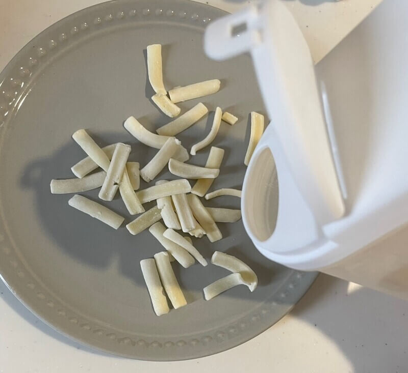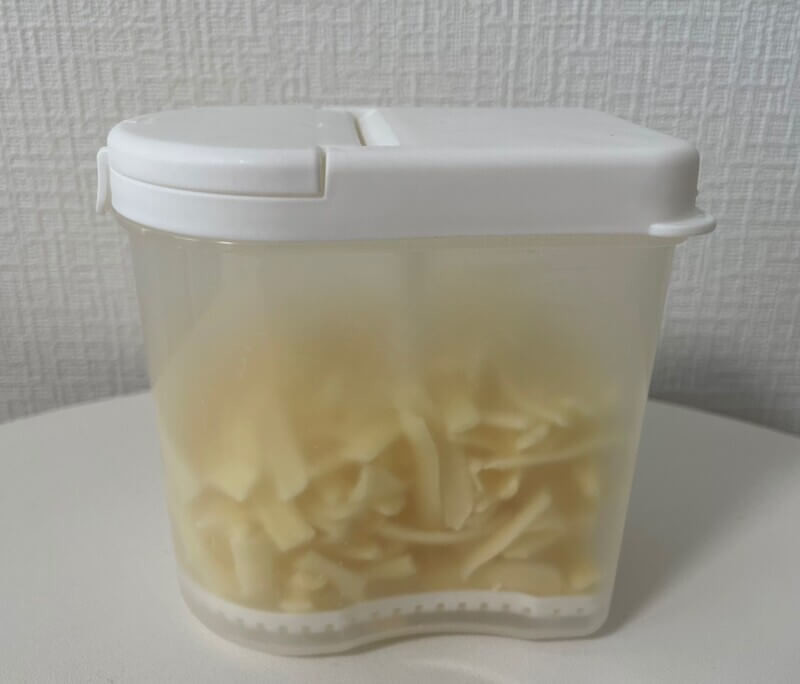 このような感じでしっかりとバラバラになった状態で出てきました。チーズを手で直接触ることなく使いたい分だけ振り出せるので衛生面でも嬉しいですね。