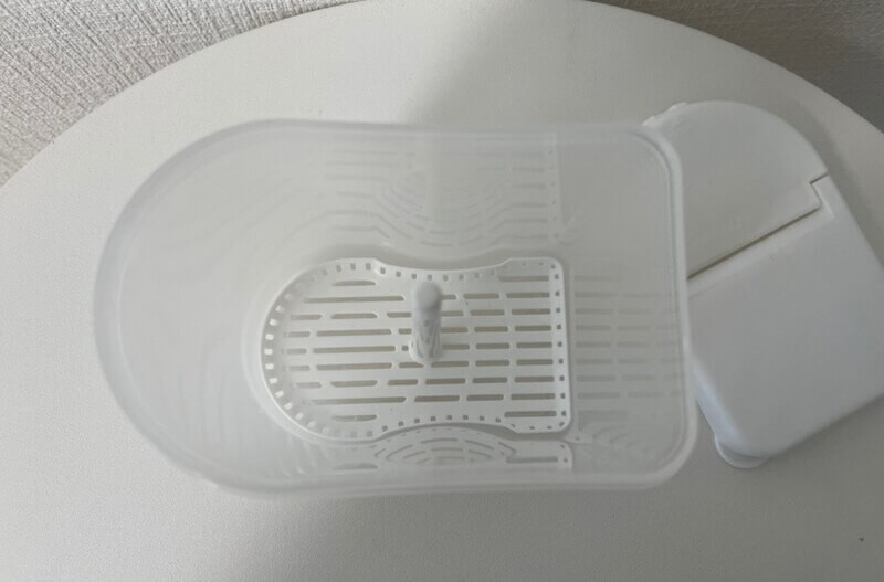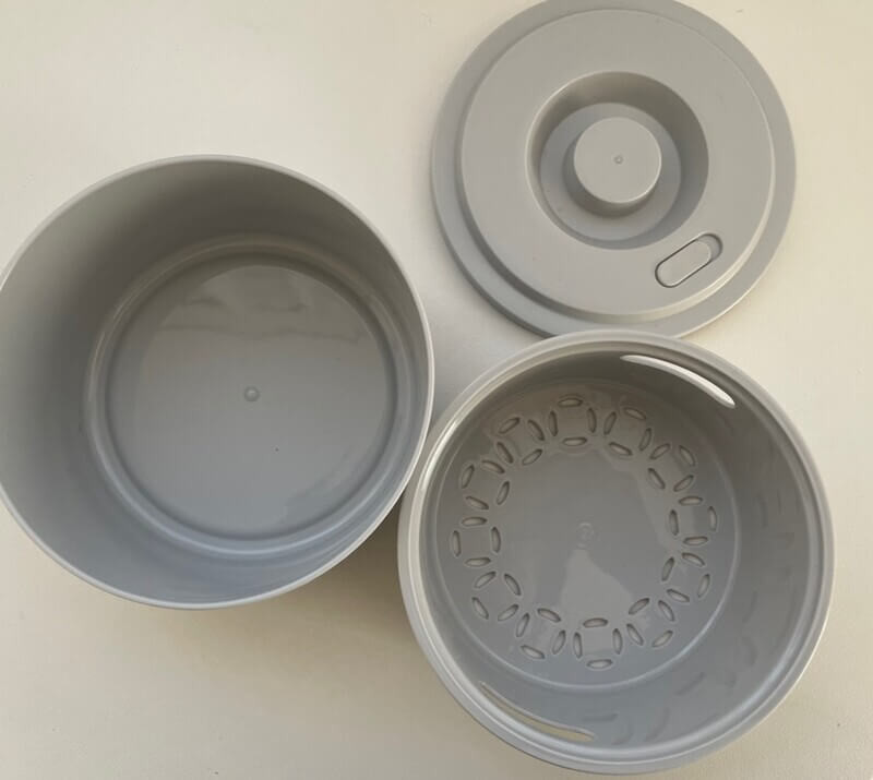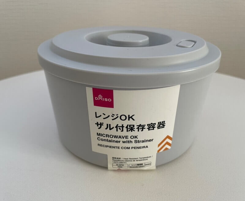 落ち着いたライトグレーで丸くてシンプルな見た目もお気に入り。素材はポリプロピレンで、フタ、ザル、容器の3つにわかれています。