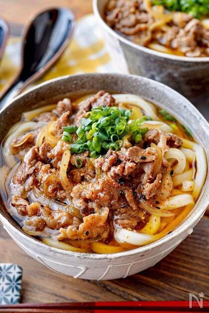 牛薄切り肉が安く手に入ったときにおすすめの肉うどん。玉ねぎと一緒に甘辛く炒め煮しておつゆで伸ばせば、旨みたっぷりの絶品肉うどんが出来上がります。牛肉150gで2人分作れるのでコスパも抜群!
