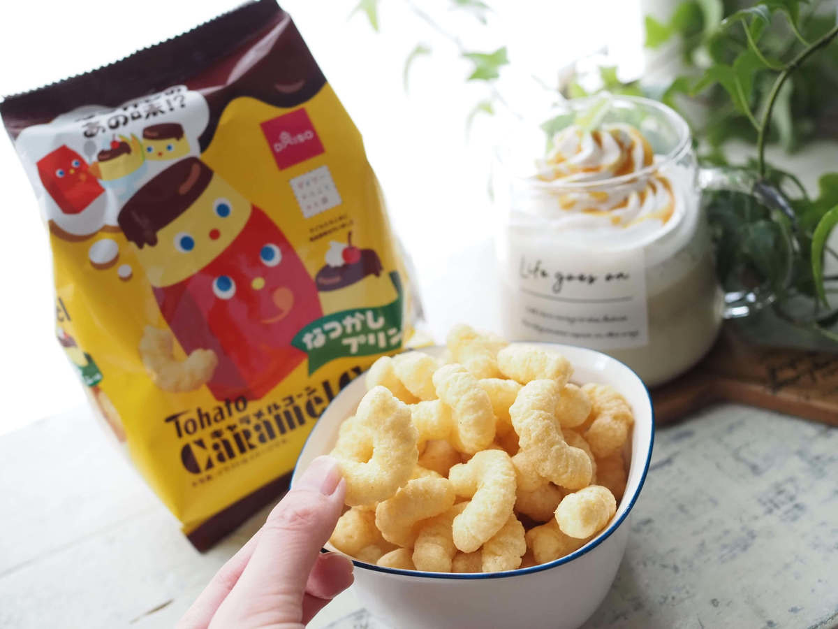 まず、ダイソーではおうち映画鑑賞のお供にもぴったりな「なつかしプリン味のキャラメルコーン」を購入。割引が適用されたらなんとお会計は8円……!