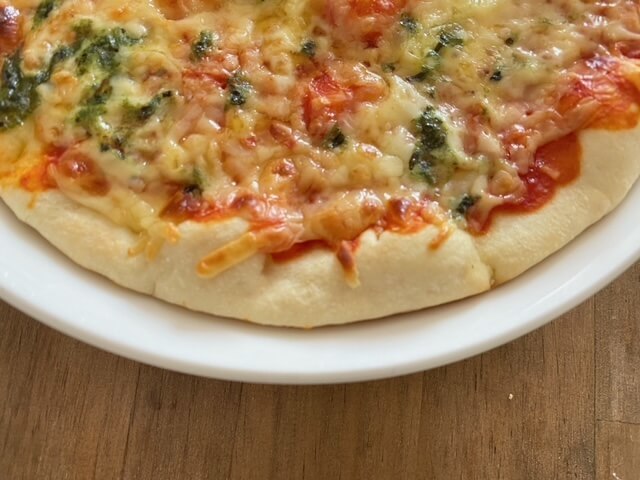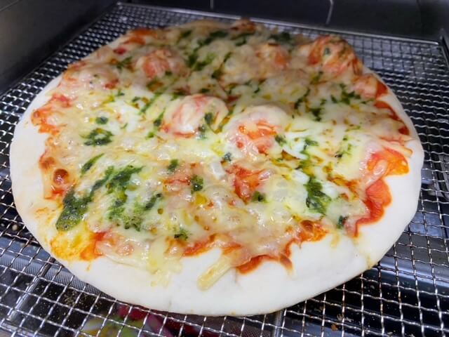 最初は5分間加熱。チーズは溶けていますが生地に焦げ目がついていないので、様子を見ながら追加で1分程度加熱しました。