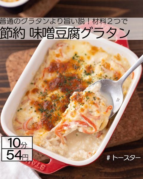 寒い夜にふぅふぅ言いながら食べたい、味噌マヨ味の和風グラタン。カットするものはなく、メイン食材はカニカマと絹豆腐だけだから、疲れて帰った夜もささっと作れますよ。