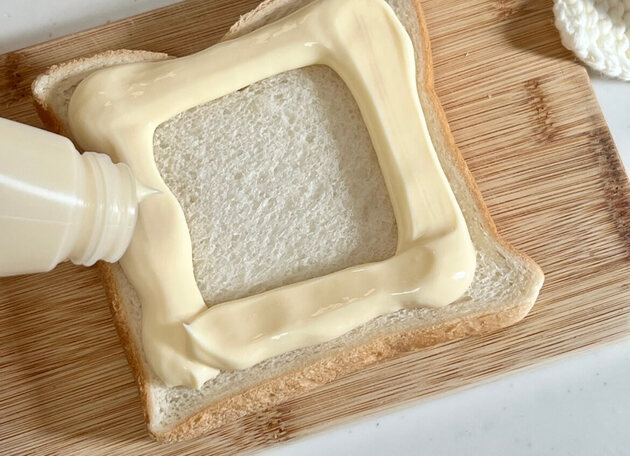 まず、食パンにマヨネーズをたっぷり囲うように出していきます。