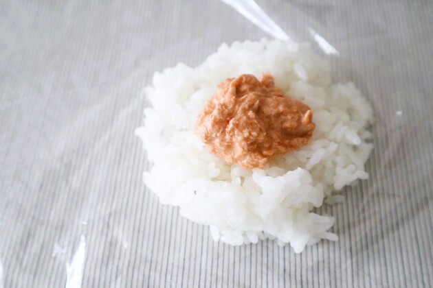 ②ラップにご飯をのせ、中央にツナマヨをのせて、さらにご飯を重ねて握る。