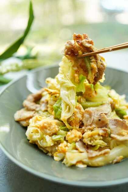 春キャベツをたっぷり使った野菜炒め。豚肉に片栗粉をまぶすことで柔らかく仕上がります。野菜に味が絡みにくい分、タレにほんのりとろみをつけて野菜自体にタレが絡むようにしています。