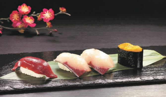 北海道や岩手県といった北日本を中心に獲れた、濃厚な味わいが楽しめるウニに、高級な有明産海苔を使用した手巻き寿司、塩釜産本マグロを贅沢に使ったにぎりや細巻、北海道産建てマスいくら(※3)をたっぷりとトッピングした軍艦など、4種の豪華食材を盛り合わせた絶品の一皿です。
