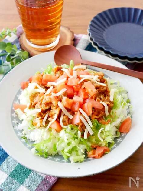 食卓が華やぐおしゃれな一品「豚こまタコライス」です。ワンプレートで野菜とお肉が一緒に摂れ栄養満点。ひき肉ではなく豚こまを使っているので、ボリュームもあります。春休みおうちランチにいかがでしょうか。