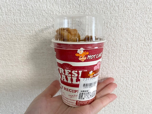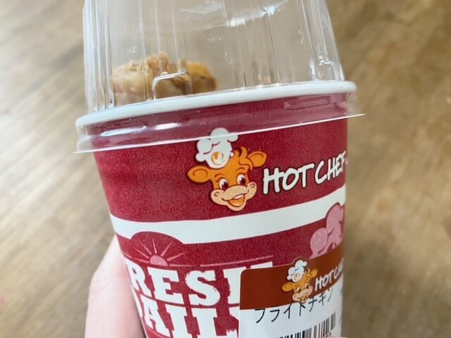 フライドチキンは紙コップのような形状のカップに入れられており、購入時に自分で蓋を付けてレジで購入するシステムです。