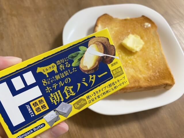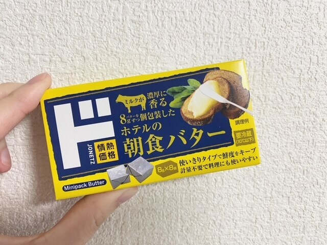 ドンキでは個包装タイプのバターが販売されていて、パッケージに記載がある通り「ホテルの朝食」に出てくるバターにそっくり♪