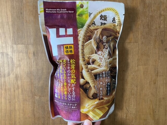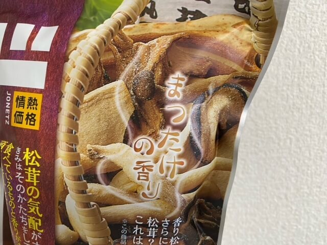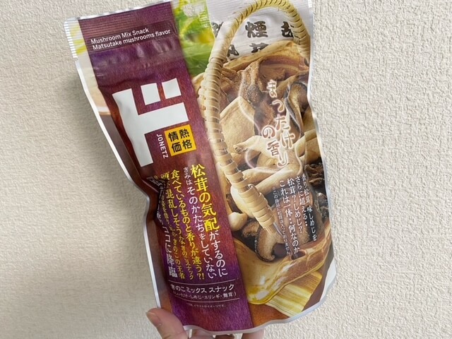 今回は、きのこMIXということで5種類のきのこ+松茸の香りが楽しめる、きのこ好きにはたまらないスナックです。