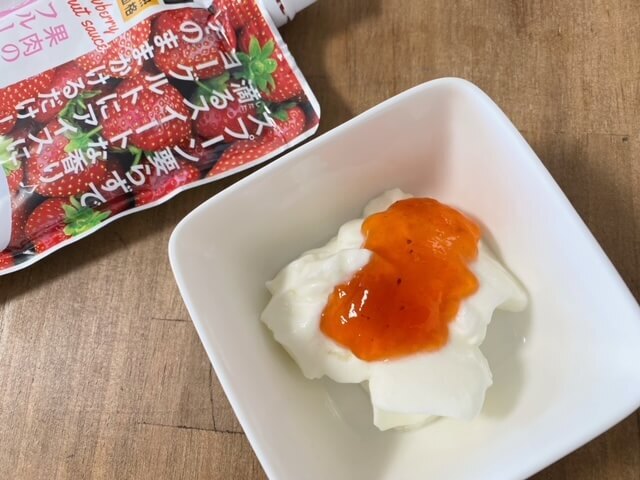 子どもたちは全体的に甘味があるほうがいいらしいので、混ぜて食べています。こうなると、もはやストロベリーヨーグルトですね!