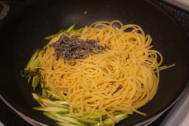 ➂➁のゆで上がりに合わせてフライパンにオリーブ油を強火で熱し、アスパラガスをサッと炒めます。スパゲッティ、塩昆布を加えて手早く混ぜ、塩・こしょう各少々で味を調えます。