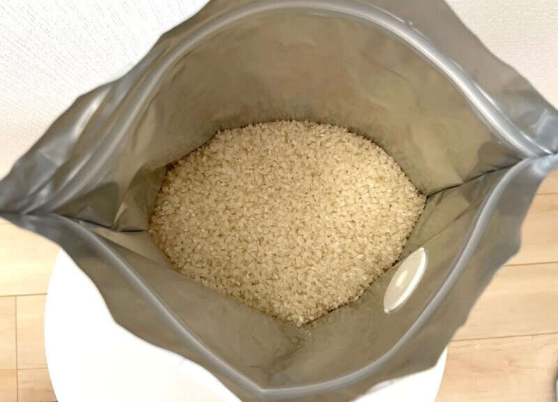 チャックを開けて、底マチを広げて立たせたらお米を入れます。