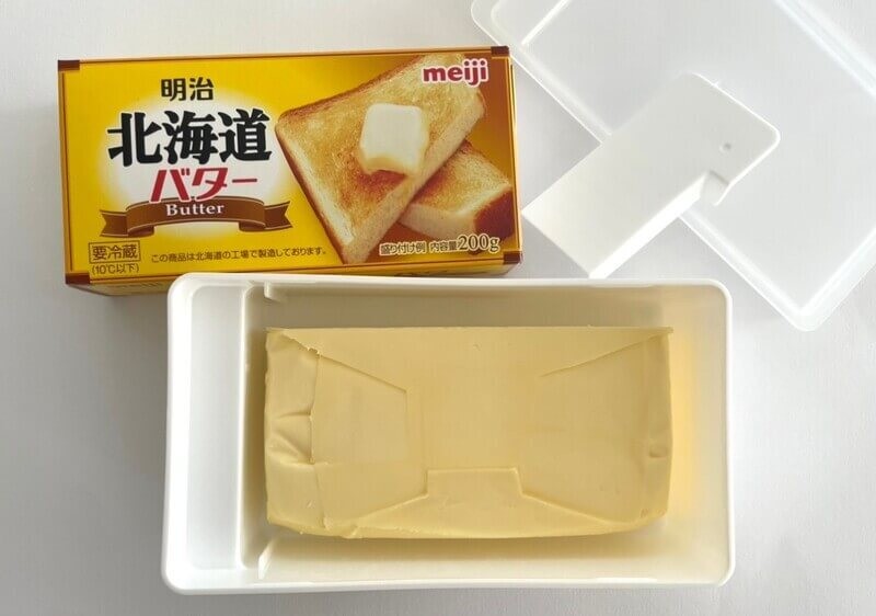 バターカッターはそのままバターケースにすっきりしまえます。市販の200gバターを入れたらこんな感じです。