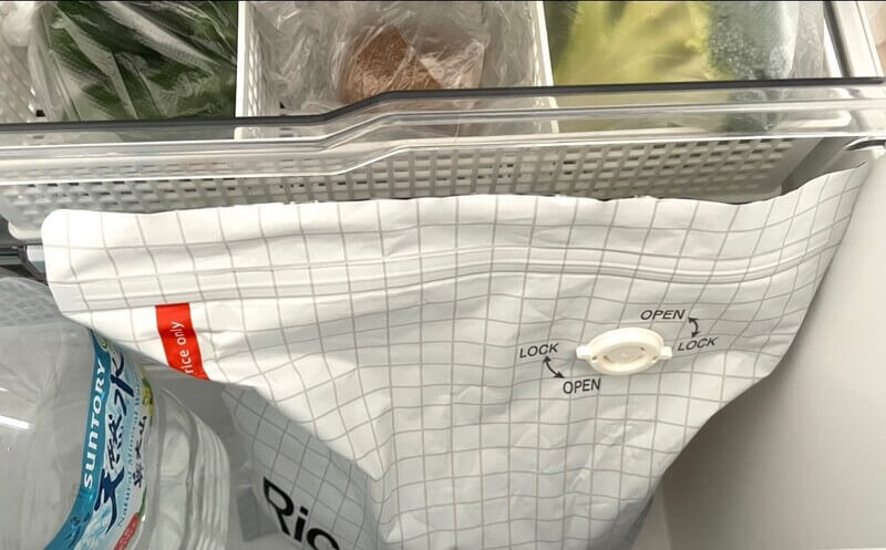 チャックをしっかり閉めます。ロック機能付きのバルブで空気を簡単に抜くことができます。