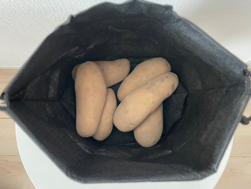 黒い不織布で光を防ぐことにより、じゃがいもが緑化しにくくなります。約1~2kgのじゃがいもが入って保存期間の目安は約1カ月です。