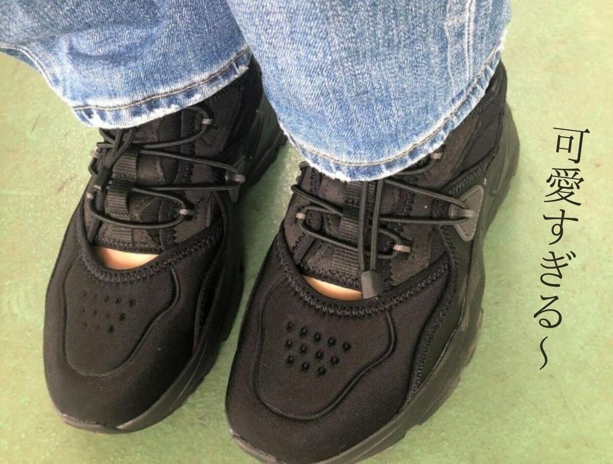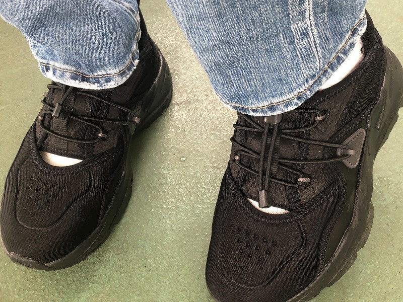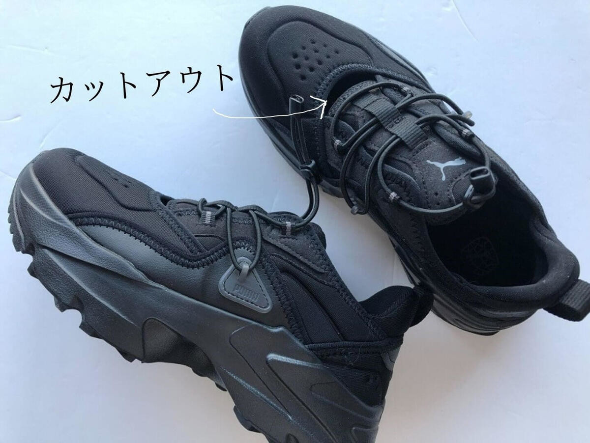 一見普通のスニーカーのようにみえますが、ライトな素材が使われておりスリッポンのようにラク~に着脱できます。ためしに着用時間を測ってみたところわずか5秒でした(感動)。
