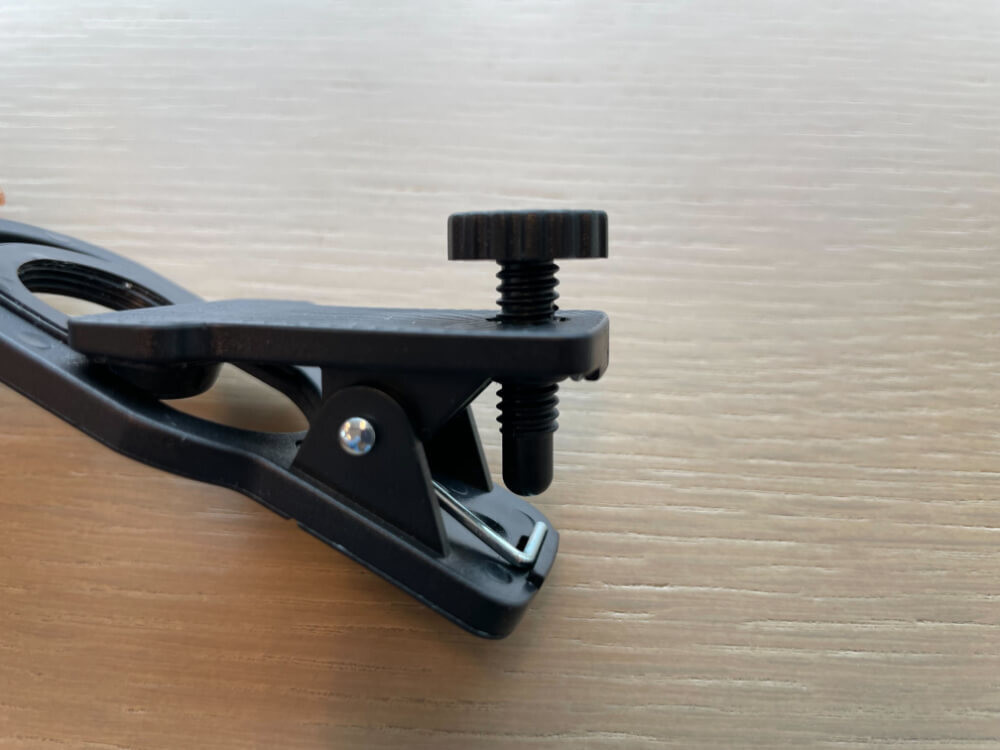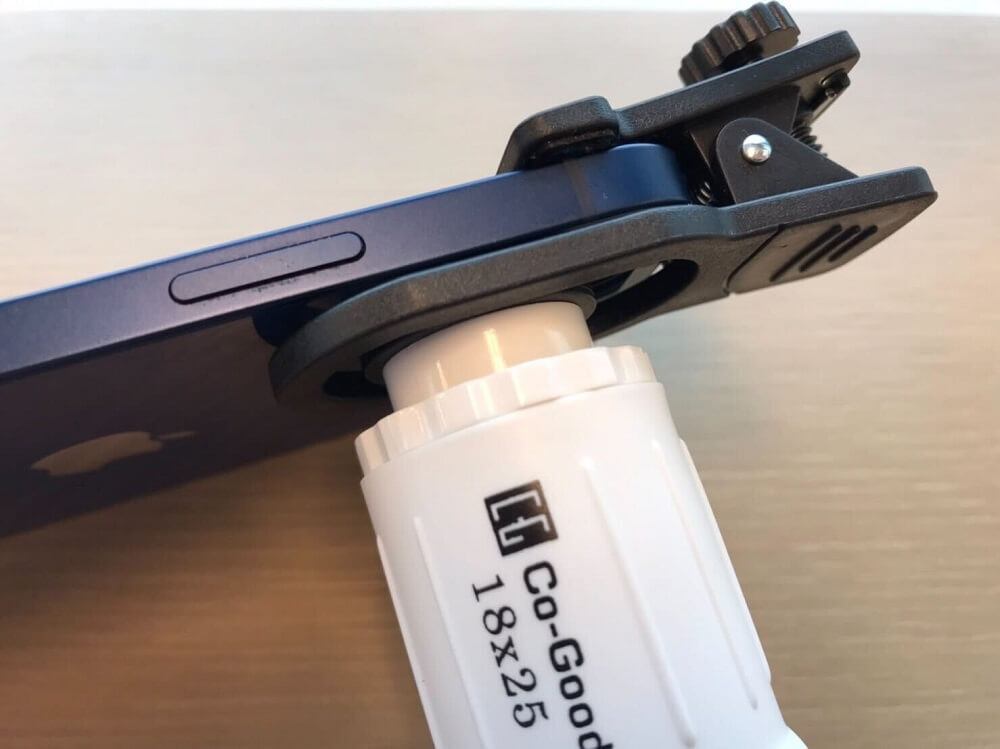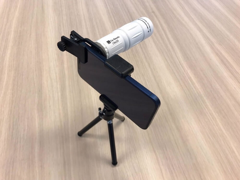 望遠レンズとして使う場合は、スマホにクリップを挟み、そのクリップに単眼鏡を取り付けます。