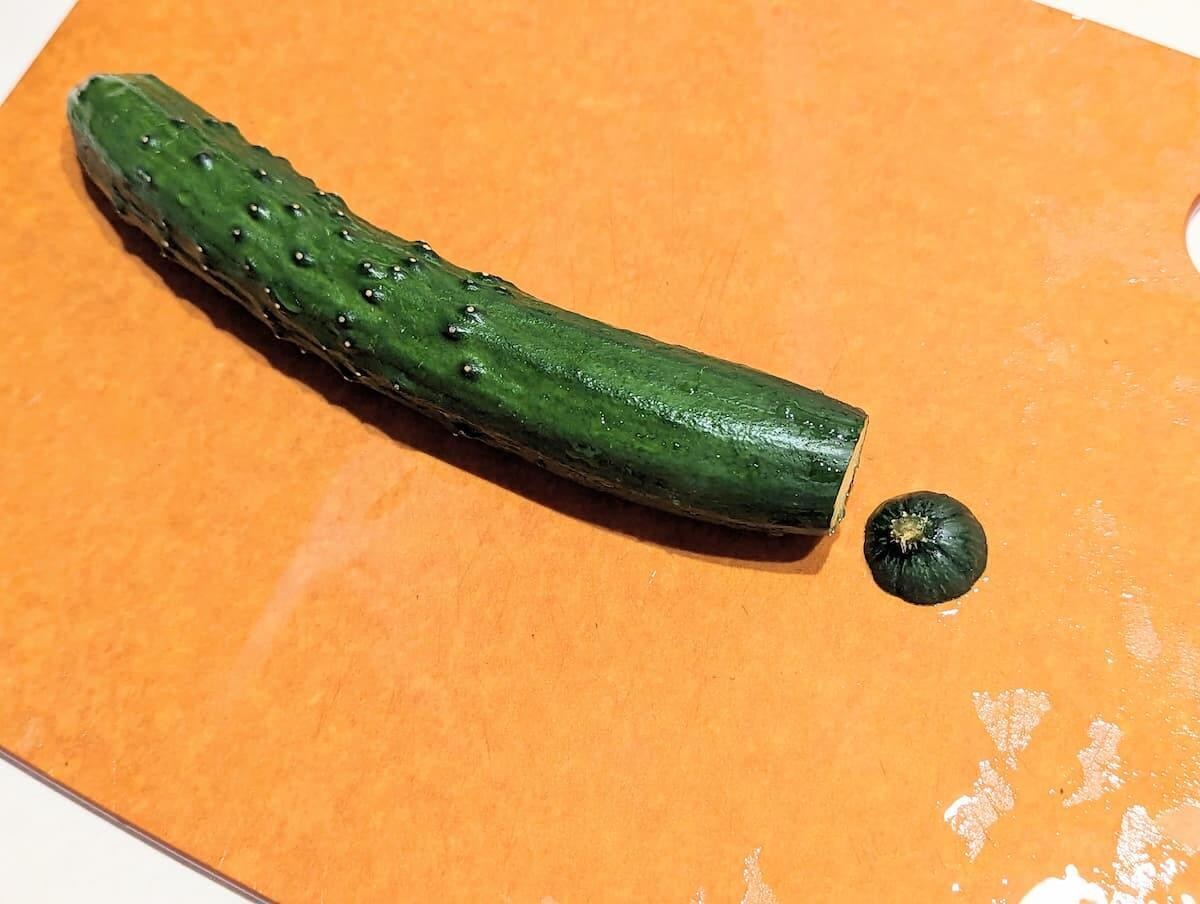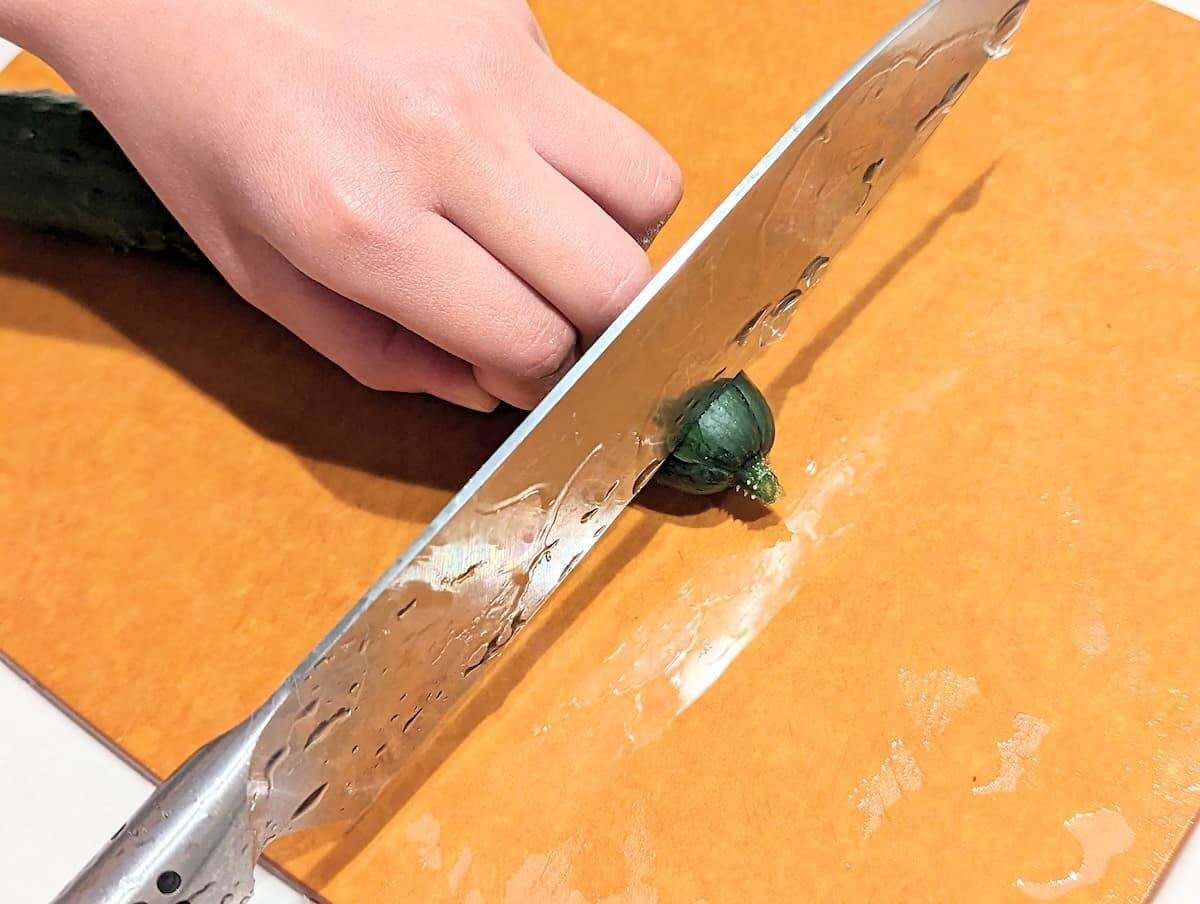 アク抜きの手順①きゅうりのヘタ側を少しカットする