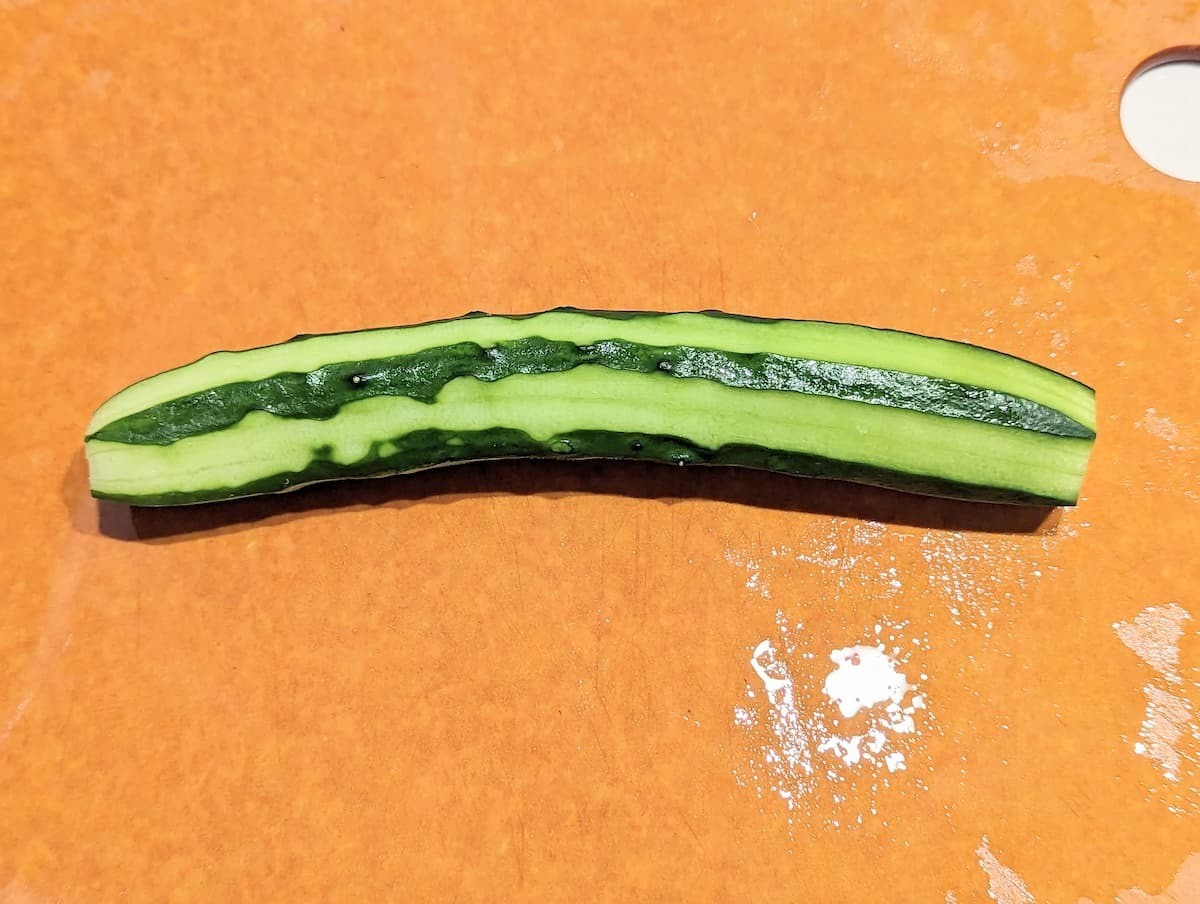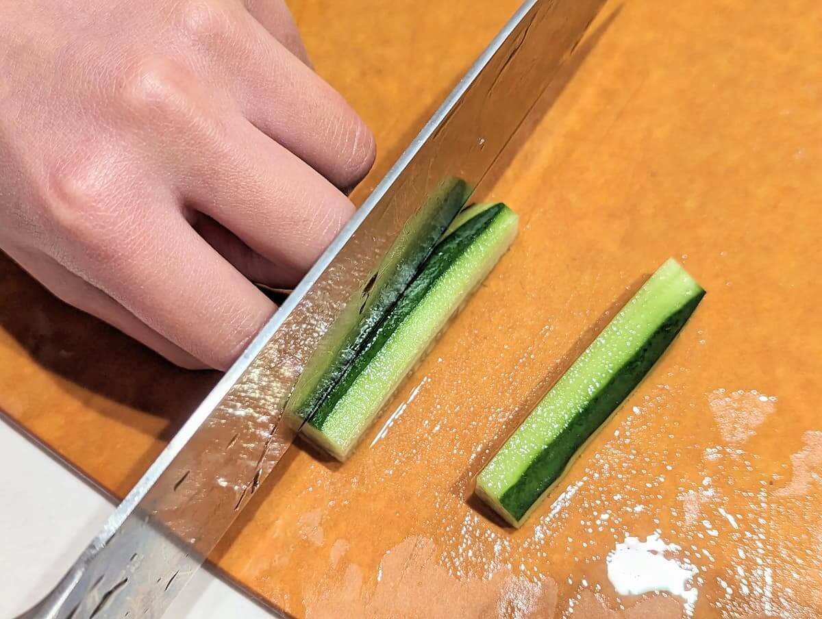 作り方①きゅうりの皮を縞模様になるように4面剥いてスティック状にカットする