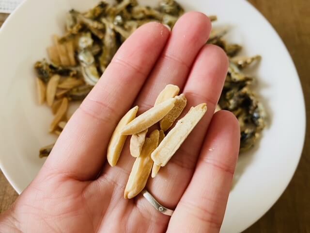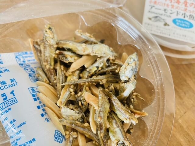 アーモンドと小魚の量のバランスは、数にするとアーモンドのほうが多いですが、全体の割合でみると小魚のほうが圧倒的に多いです!