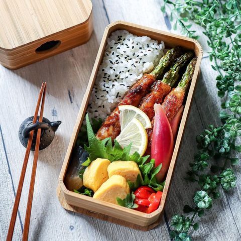 合挽き肉でアスパラガスを丸々1本包み巻き。アスパラガスの食感が楽しく、肉感も味わえるので満足感が満点です。甘辛味はご飯にピッタリ♡見た目のインパクトも抜群なので、ぜひカットせずにお弁当箱に詰めてみて。