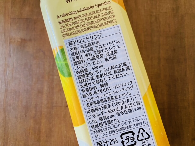 アロエベラドリンクはパッケージが日本語で記載されていましたが、梨ジュースは全て英語で記載されています。