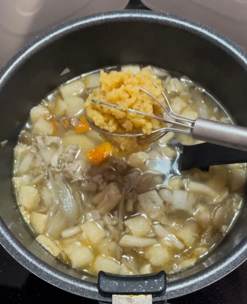 すくった味噌はそのまま、お鍋のお湯の中に入れます。