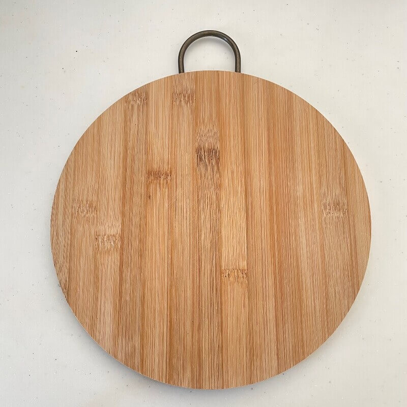 金属フックの持ち手がついた丈夫なバンブー素材のカッティングボードです。