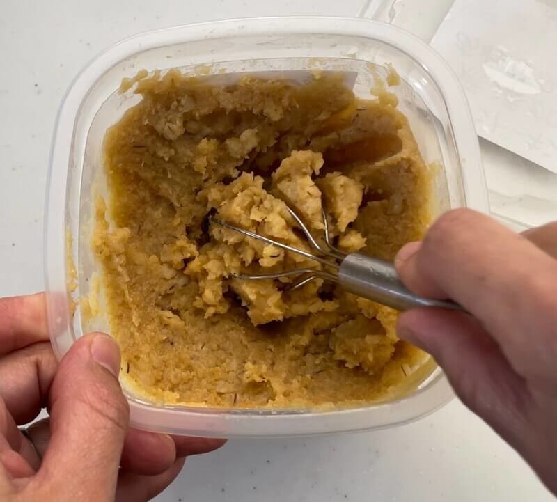 味噌にマドラーをズボッと入れて、引き上げれば一度に約大さじ4杯分の味噌をすくうことができます。