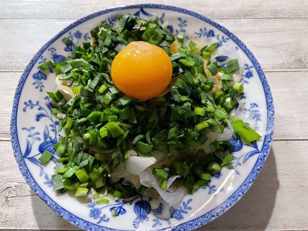 ⑦細かく切ったニラと卵黄をのせたら完成。
