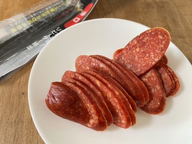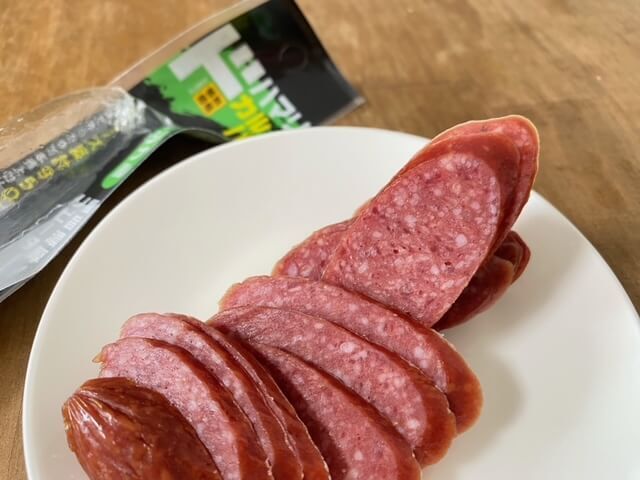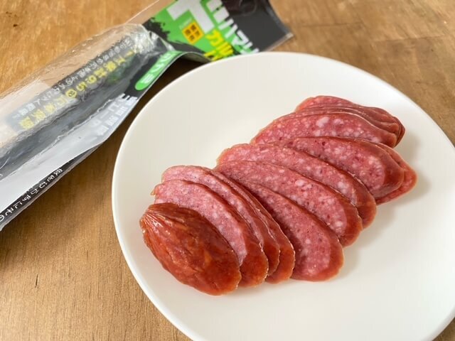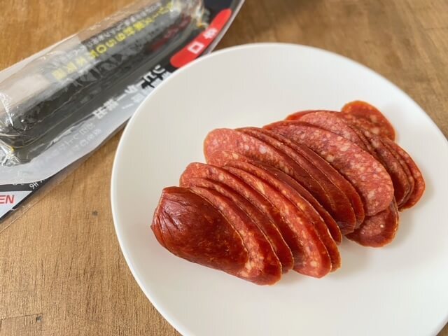 ちなみにサラミとカルパスの違いは、サラミは豚または豚と牛肉が原料で、カルパスは豚肉と鶏肉を混ぜたものを原料として使用しているそうです。
