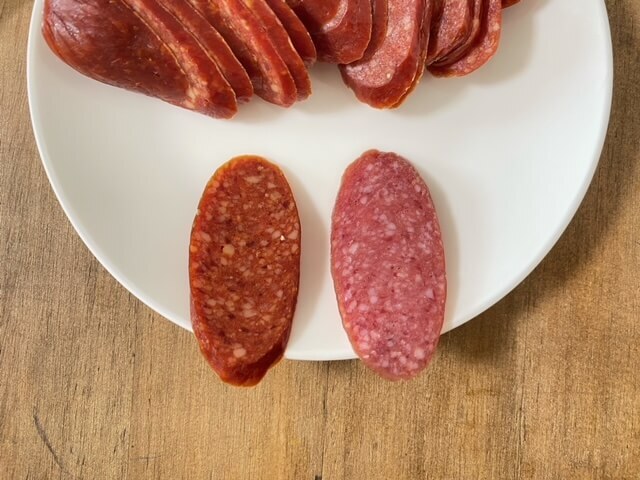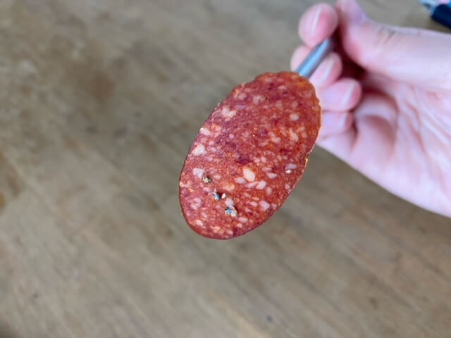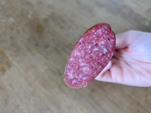 カットしたカルパスは中にギッシリとお肉とラードがギッシリ!