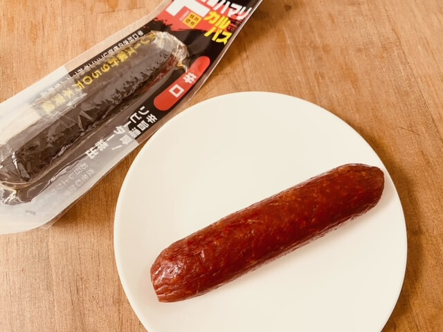 カルパスと言えば、小さくカットされた個包装のものを思い浮かべますが、ドハマリカルパスはサラミのように大きくて自分で好みの大きさにカットするタイプです。
