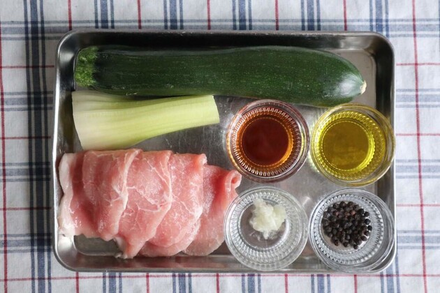 ①ズッキーニは厚さ1㎝の輪切りにし、セロリは厚さ5㎜の斜め切り、豚肉は1枚を6等分に切ります。