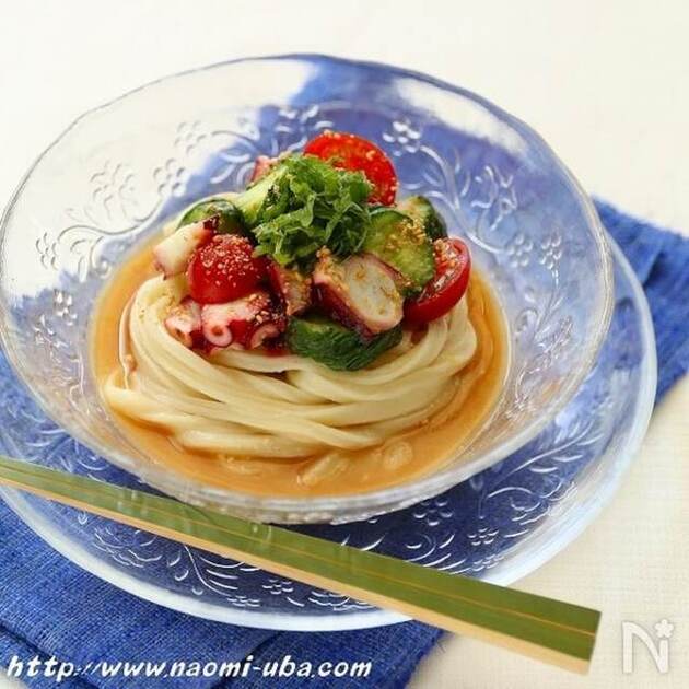 暑くなるこれからの季節にぴったりな、タコと夏野菜のごまだれうどんです。タコの食感が良いアクセントに。大葉の爽やかな風味がごまだれの美味しさを引き立てます。