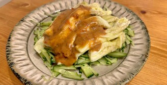 千切りきゅうりとカニカマをごまマヨネーズで和えた超特急サラダ。コクのあるまろやかな味付けで、淡泊なきゅうりが旨みたっぷりの一品に。冷蔵で1~2日ほど保存可能なので、翌日もおいしくいただけます。