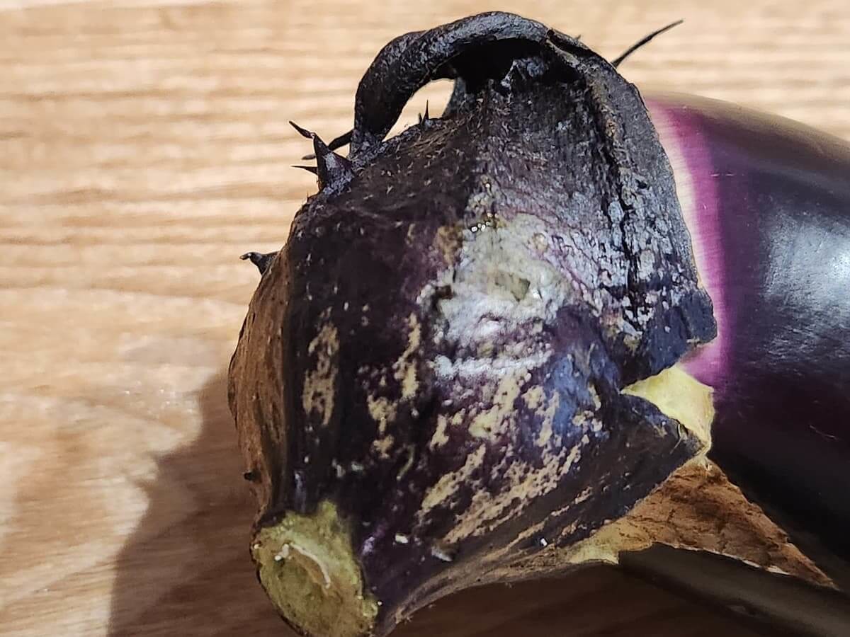 なすのヘタはカビが生えやすく、ガク付近の実は腐りやすいんです。腐っているときは実がオレンジ色に変色します。