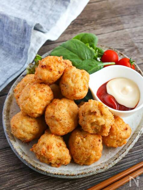 豆腐がたっぷり入ったふんわり食感のナゲットです。一口サイズで食べやすく、お弁当やおつまみにも最適!お好みでケチャップやマヨネーズをつけて召し上がれ。