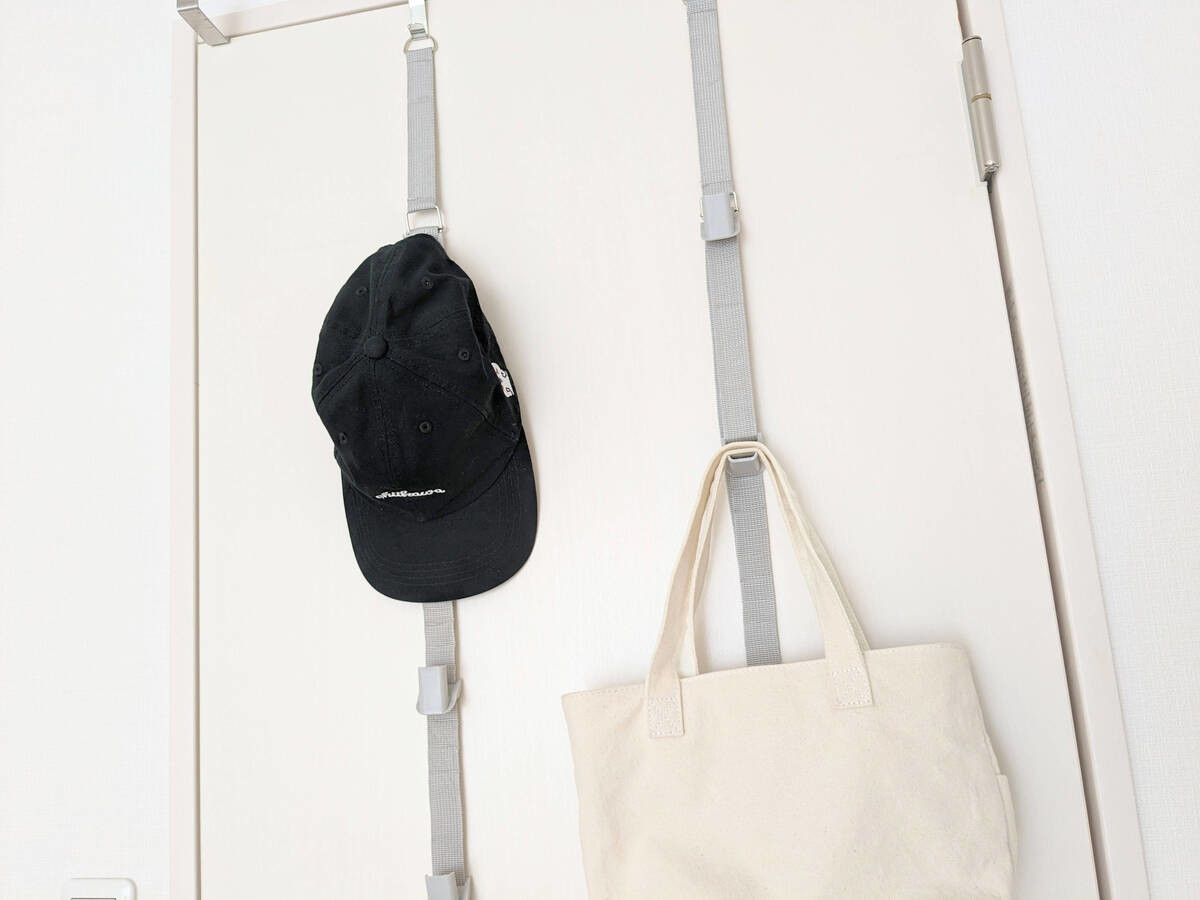 ドアフック収納を2個使っても、ごちゃごちゃせず見た目もすっきり。 ここには収納場所に困っていた帽子や、よく使うバッグなどを吊るしてみました。