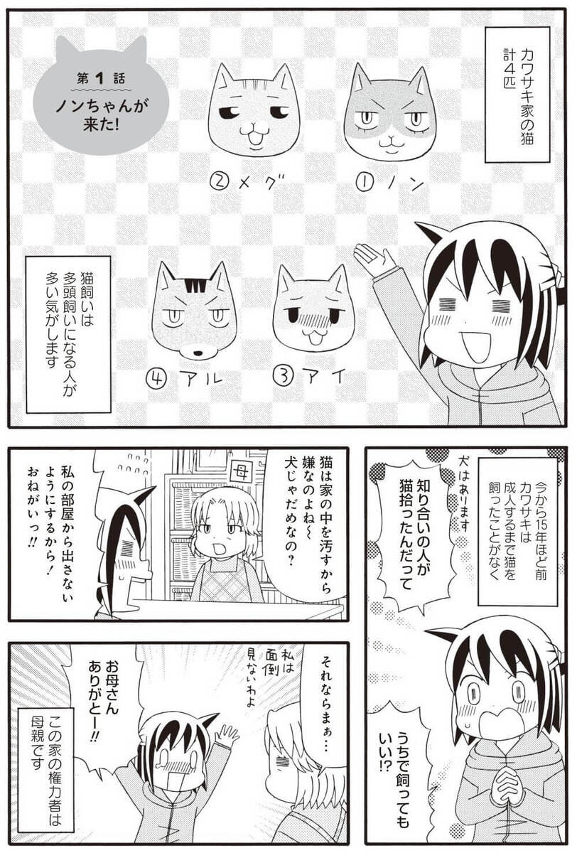 一匹の仔猫を引き取ったことをきっかけに、猫の沼にどっぷりハマってしまった、漫画家のカワサキカオリさん。縁あってメンバーは4匹に増えて、ますます賑やかに。